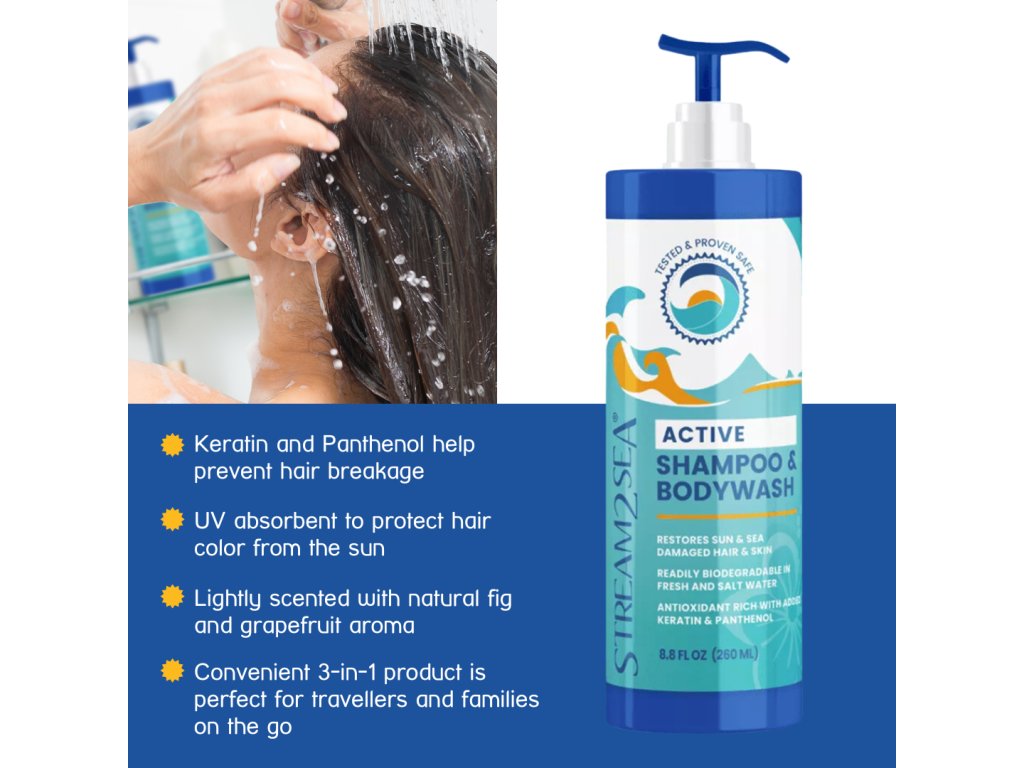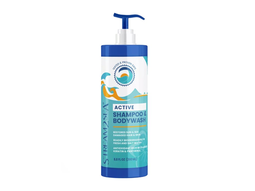 Nový aktualizovaný design, stejné složení! Vyčistěte, ošetřete a posilte své vlasy a pokožku šamponem a sprchovým gelem Stream2Sea s naší silnou antioxidační směsí zeleného čaje, tulsi, wakame a olivových listů.
